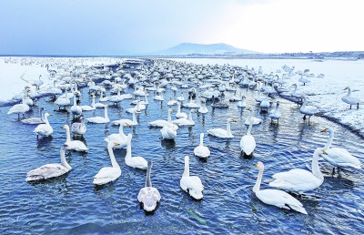 11月27日,在山东省荣成天鹅湖国家级自然保护区一处水域,成群的大天鹅在雪中漫步、游弋、觅食,与雪景相映成趣。