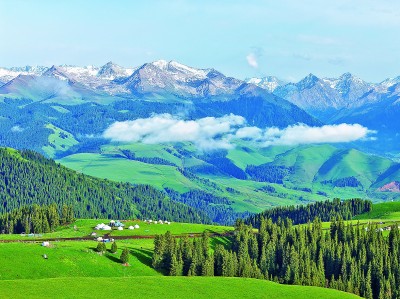 5月24日,一场降雨过后,位于新疆特克斯县境内的喀拉峻草原,云雾如轻柔白纱缭绕在森林和山峦间,广袤的草原经过雨水润泽愈发青翠,令人神往。