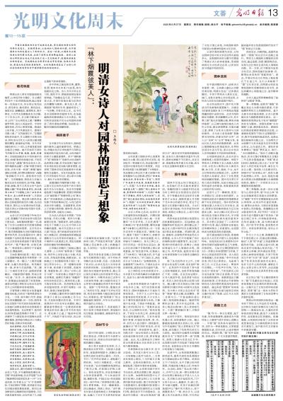 中国古典园林的历史可追溯至先秦,有关园林的诗文创作同样历史悠久。至晚明清初,江南的私人园林的兴建,为中国园林文化的发展注入了新的活力。在这一时期,以园林为主题的诗文创作蔚为风尚,达到了前所未有的繁盛局面。善诗工画的士绅阶层女性也日益活跃于这一文化场域中,使园林诗焕发出新的意涵。家族园林成为闺秀们表达审美情致、体现文化身份、营造女性空间的重要场所。女性的园林诗表达了女诗人对社会性别的思考和对中国诗歌传统的深切回应。 植花咏蔬 明清女诗人常在宅邸庭园栽花植草,以赏花抒怀为雅好。甘立媃所作《花中十友诗》即是佳例,她以每首咏一花结谊为友,其分别以桂花仙友、荷花净友、梅花清友、菊花佳友、海棠名友、酴醾韵友、瑞香殊友、栀子禅友、兰花芳友及蜡梅奇友为诗题。于十首诗之后,甘立媃又赋尾诗一首,以抒广交女性贤友之愿:“解颦有意弄芳妍,恰比人间益友贤。半世吟魂资伴侣,百年心事寄诗篇。愁城乐土纷开谢,月夕风晨见性天。愿得万花都入谱,广交四海得忘年。”在霞蔚缤纷的诗境中,甘立媃把万花视为知音,同时也与历代文人的同主题诗歌隔空酬唱,意境深远开阔。甘氏另有《梅花绝句三十首》,以多重角度呈现出梅花之神韵。她不仅咏叹不同时节的梅花(如早梅、晚梅、春梅、寒梅等),亦细致刻画其在不同环境中的姿态:岭梅“数枝斜耸插云窝,千树花开总后他”;溪梅“落花水面无人问,莫作桃源浪品题”;官梅“相看官阁花初放,古色今香一样清”;野梅“幽性清标识本稀,荒村野径偶相依”;瓶梅“修到梅花不计年,胆瓶相对亦前缘”。尤具雅趣者,则是诗人对她与梅花互动关系的描写,如寻梅、观梅、折梅、画梅,更不乏具有女性气息的簪梅之趣(“昨夜芳林春有信,新从镜影上钗头”)与嚼梅之味(“拈来尝试吟花口,直沁诗脾香味除”),尽显细腻别致之情思。晏诉真与张纨英也曾以自家庭园所植花卉为题,各自创作组诗,晏氏以34首律诗咏花写意,而张氏则以8首律诗绘写园中花事,诗风隽秀朗润。 女诗人们不仅钟情于吟咏花木之美,更缱绻于采录亲身参与园艺的日常生活。如张藻的《移菊》一诗,描绘了女诗人在晚秋亲手把菊花移植于宅中静逸园的图景。在历代诗文中,菊花常被隐喻为历经风霜的孤高傲岸的风骨,而在张藻的诗中,菊花却超脱于这种经典形象的复造。诗人以女性的身体柔弱给予菊花笃爱的呵护:“霜严勤护惜,切莫任离披。”一种审美的心绪伴行于有温度的生活,飘逸流转。 又如张藻的《画菜二绝》,将自己在园圃种植蔬菜的寻常琐事一并入画题诗。其一题曰:“土膏浮动露痕青,生趣天然涉笔成。却笑髯苏贪一饱,煮来午后说消酲。”其二题曰:“江南雨后青尤好,抽得新芽黛嫩凉。半幅家园好烟景,凭添白苋与红姜。”在诗、书、画的韵味交融中,张藻通过造境拓展了审美想象,透显出明清士绅阶层女性在生活和艺术之间所颐养的审美情致。 尽管明清士绅阶层女性普遍喜爱植花咏蔬,但亲自下地种菜者较为少见。一方面,家中婢仆代劳,使她们无须亲履园圃;另一方面,闺秀身份也受到那个时代的世俗伦理约束,以致她们亲耕农桑的举动常被视为有违闺秀规范。在此背景下,张印的长诗《种菜》就显得颇不寻常了。此诗摒弃了六朝宫体诗对闺阁生活柔靡的藻饰,淳然地勾勒出诗人与婢女四时种蔬、同耕共作的场景: 我性喜种植,况此多荒陂。 春风吹浩荡,人意良迟迟。 赤脚灶下婢,饭后辄酣嬉。 亦欲课之读,目不识书诗。 顾使把犁锄,欣然愿我随。 荆榛既日辟,礧砢亦日夷。 于此压豆荚,于彼播露葵。 秋菘与春韭,燥湿相所宜。 纵横有经纬,我心堪自师。 中馈及暇日,到此神旷怡。 会当微雨过,生理渐以滋。 破土玉芽茁,临风翠叶披。 哑然时失笑,暴富同贫儿。 读罢全诗,素朴的画面中仿佛溢出泥土气息,不可遏制地弥漫而来。首联“我性喜种植,况此多荒陂”化用了陶渊明《归园田居》(其一)中“少无适俗韵,性本爱丘山”与“开荒南野际,守拙归园田”两联,显然意在向这位田园诗派的鼻祖致敬。张印以亲身耕耘呼应陶渊明的归隐理想,不但无损其闺秀身份,反而平添了几分脱去脂粉气的审美情致。 诗中所咏之蔬包括豆荚、露葵、菘菜(类似今之白菜)与韭菜,皆为庖厨俗见之物。诗人不仅识其生长习性、晓其节令,更能因地制宜地安排种植,于细微处见巧思,于劳作中显从容,字里行间饱含着与自然对话的馨雅与娴熟。最为动人者,当属尾联“哑然时失笑,暴富同贫儿”,一句自嘲,尽显丰收之乐。这不仅是对田园耕种的温情书写,也是超越物质的精神满足与文化姿态。张印的劳动体验不仅为女性园林诗增添了质朴落地的野趣,也拓绘出一幅空间建构的园圃图景。 桐阴教子 在中国古代文化传统中,园林是践行教养之道的重要空间。明清之际,伴随女性识字率的提升与母职在家庭结构中地位的凸显,女性诗画中的育子主题显著增多。其中“桐阴教子”或“桐阴课子”是清代女性诗画作品的常见主题,其不但体现了她们对母亲角色的自觉实践与教育理想,也表明了园林空间在家庭教育中的重要性日益提升。在花木扶疏间,母亲们不仅传授诗书礼仪,更以草木为媒介,教化子女性灵的塑成。 翁瑛《题自写桐阴教子图》一诗,以图文互证的形式将育子的日常经验升华为文化象征。其诗不仅描摹庭